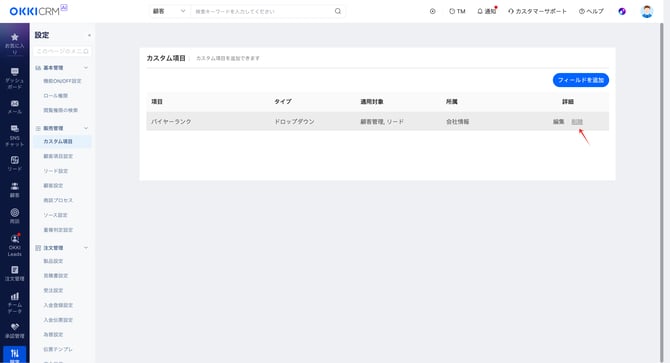 また、カスタム項目を削除する際は、「設定 > カスタム項目 > 削除」から操作してください。