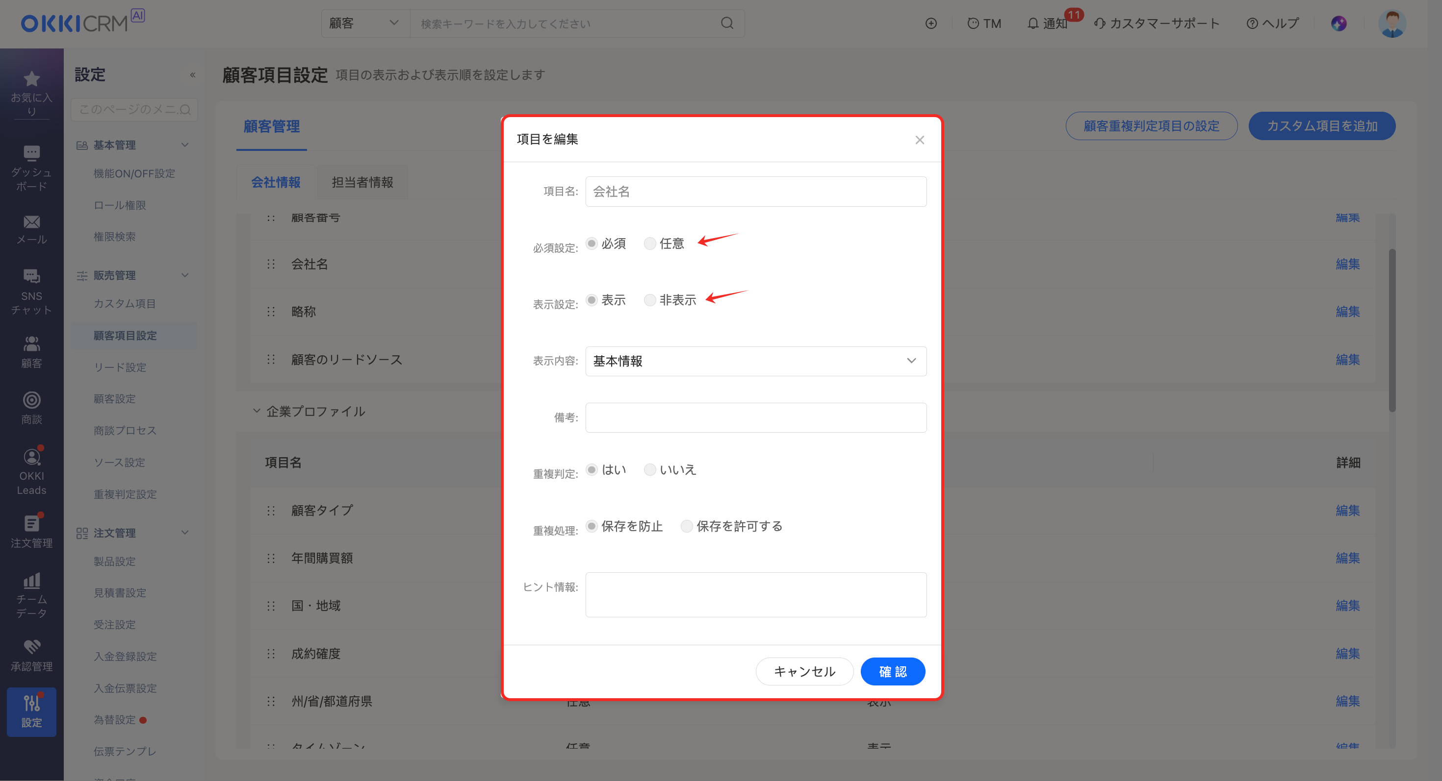 保存後は、「カスタム項目」も同様に編集ボタンをクリックすることで、表示/非表示の設定や、必須/任意入力の設定を行うことができます。
