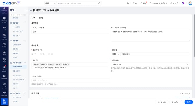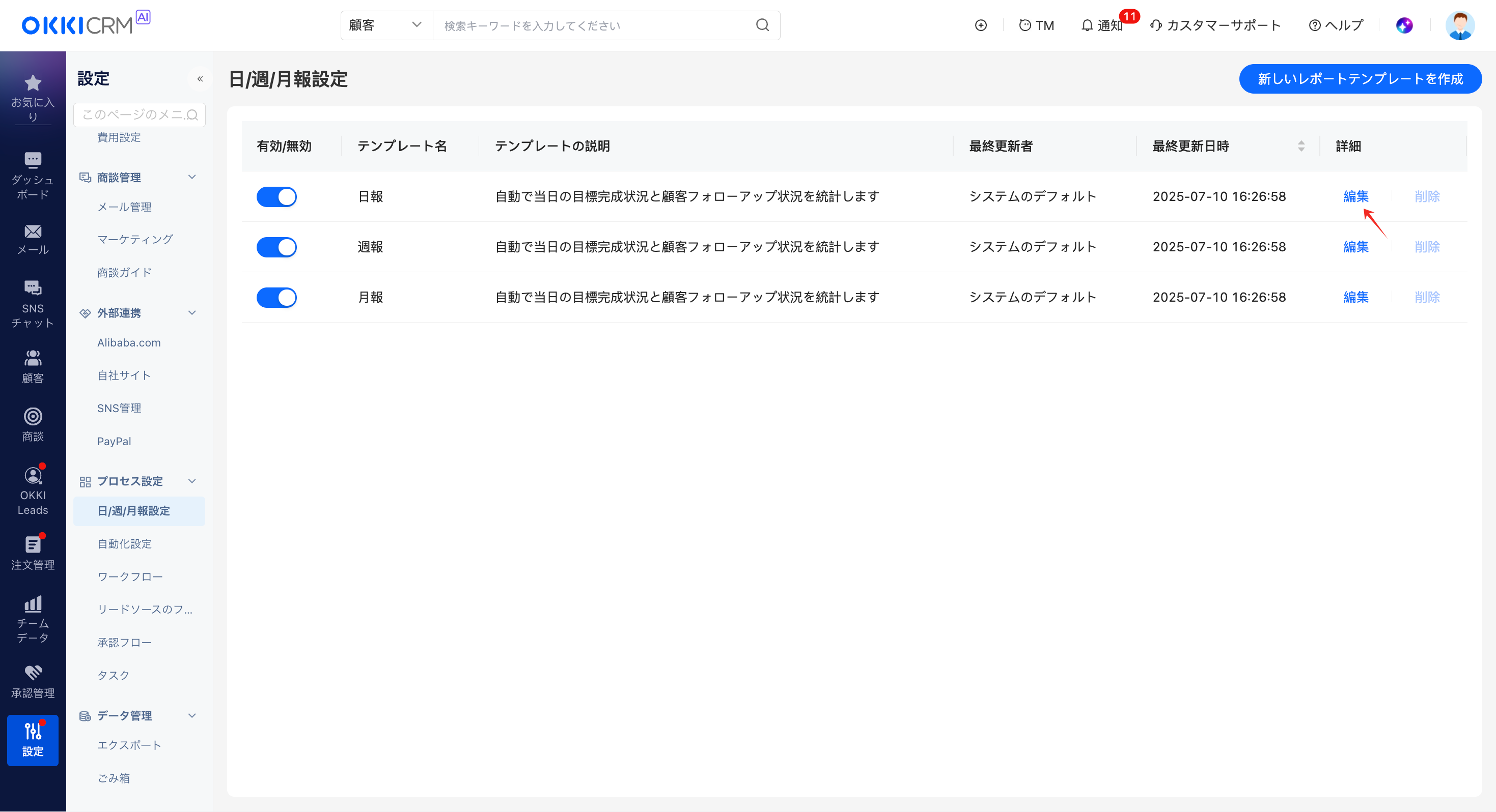まず、「設定>日/週/月報設定」へアクセスし、編集する項目を選択して編集ボタンをクリックします。
