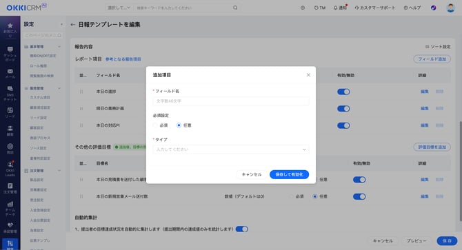 レポートの入力項目は、『編集ボタン』をクリックすると編集が可能です。また、『項目を追加』をクリックすれば、新しい入力項目を追加することもできます。
