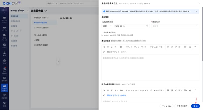 「チームデータ>自分の提出物>業務報告書を作成」をクリックします。