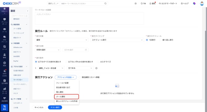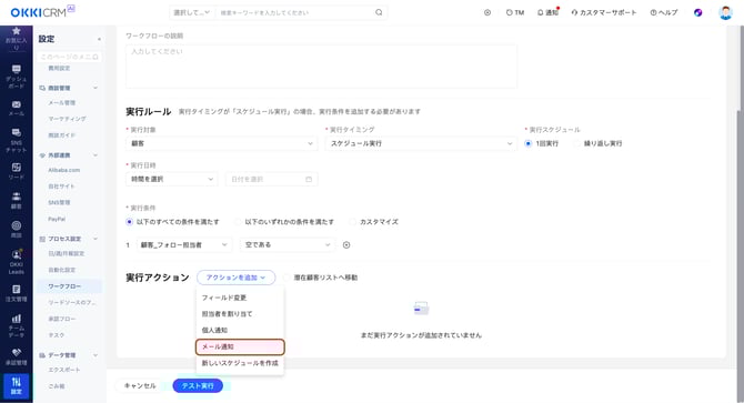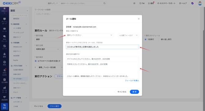 Step4. 実行アクションを設定します。例えば、通知対象者(メール受信者)を選び、メール本文を記入します。営業担当者名や金額などの情報は、項目挿入機能を使ってメール内に表示させることが可能です。