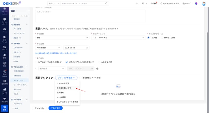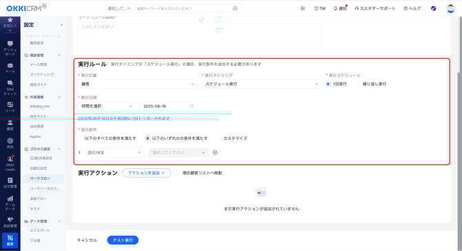Step2. 実行対象を「顧客」、実行条件を「毎日チェック」、開始時刻は「翌日」からとします。