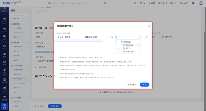 Step3. 実行条件として、「次のいずれかを満たす」→「顧客のフォロー担当者が未設定」であること(=潜在顧客)を指定します。