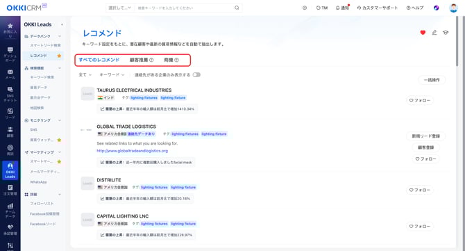 レコメンド機能では、ユーザーが設定したキーワードに基づき、AIが潜在顧客情報や最新の貿易情報などを自動でピックアップします。