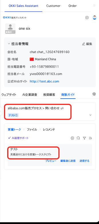 ⑥alibaba.comやメールで営業アシスタントから商談ガイドでトークスクリプトが使用できるか確認してください。