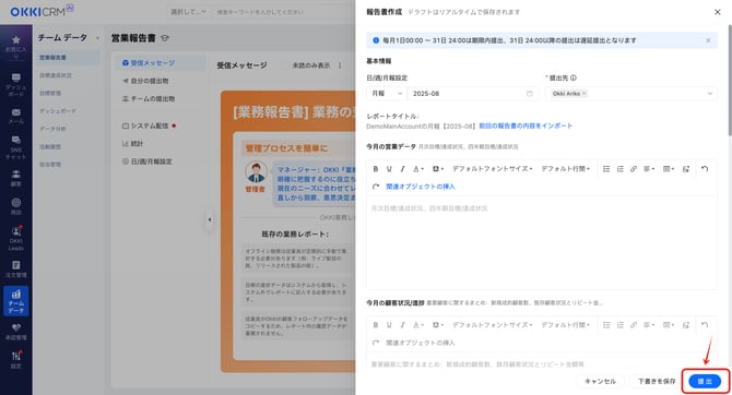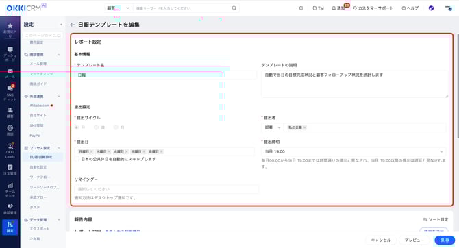 レポート設定:テンプレート名、提出日、提出期限、リマインダーなどを設定可能