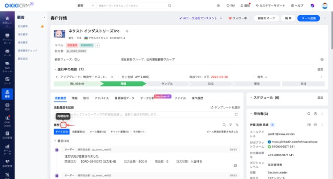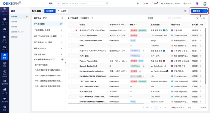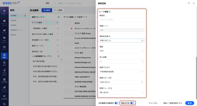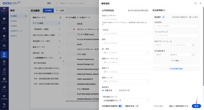 2026/01/21 手動登録 本記事では、顧客を手動で登録する方法についてご説明します。 アクセスパス:顧客 > 担当顧客or潜在顧客>顧客登録 必要な項目を入力し、「確定」ボタンをクリックすることで、顧客情報を新規登録できます。 「対応履歴を自動保存」機能をオンにすると、顧客とのメールやメッセージのやり取りに基づき、顧客詳細ページの「履歴」に自動で活動履歴が記録されます。 「商談を作成」をオンにすると、新規顧客の登録と同時に、新規商談を作成することができます。