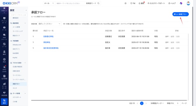 「設定>承認フロー管理」承認フロー管理ページを開き、「新しい承認フロー」をクリックして開きます。