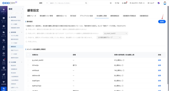 顧客上限では、自動で顧客を登録する際に、担当者の上限数を超えた場合の登録ルールを設定できます。