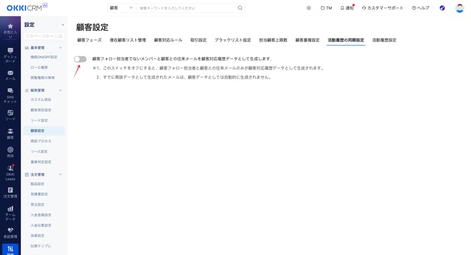 商談履歴の自動同期設定では、機能をオンにすると顧客の連絡先とのメール履歴を基に活動履歴を生成します。
