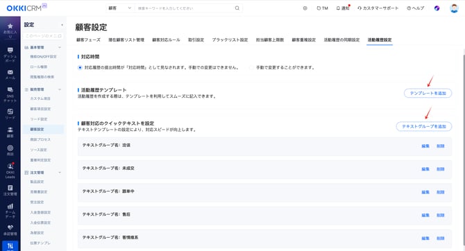顧客対応設定では、活動履歴のテンプレートや、活動履歴に使用する項目の設定ができます。